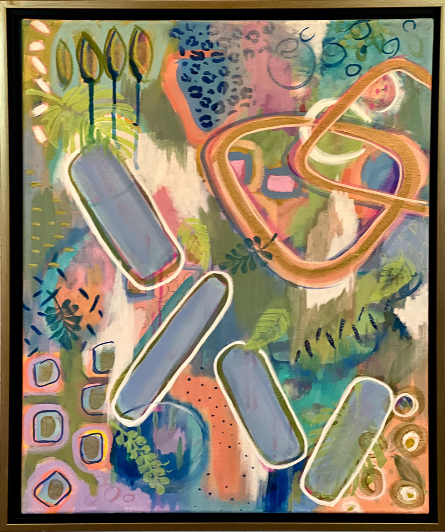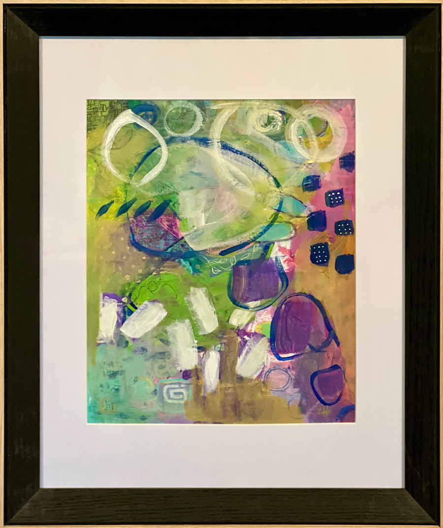 Color evokes emotion. The abstract series, called HAPPY HOUR, is a break from her usual style. It says “I choose JOY!”. Allowing the viewer to interpret what they see and label what they choose.