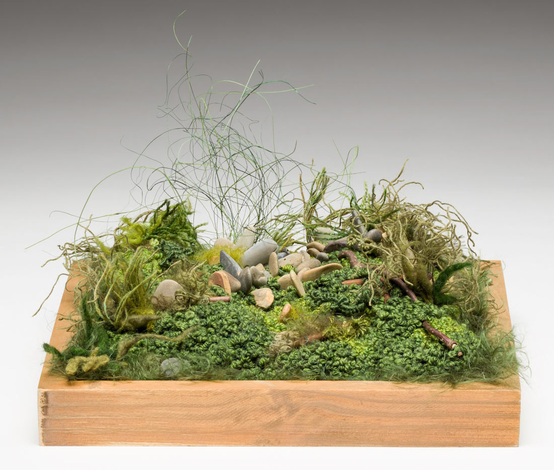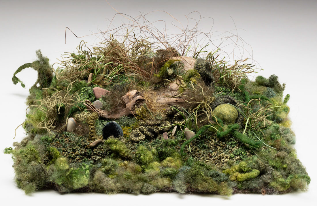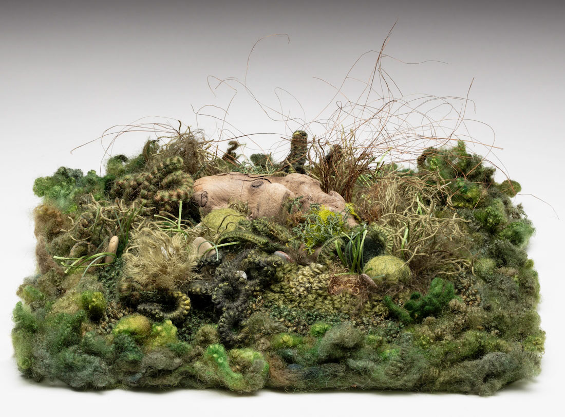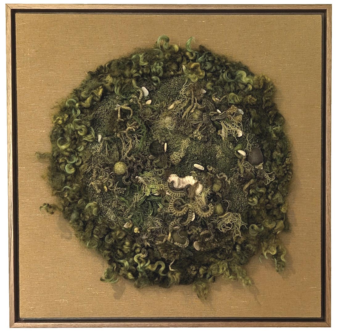 My journey began in the garden, where I learned to trust unseen forces such as the microherds and worms to transform dead dirt into a thriving landscape. I work with fibers and stitch because I need that same visceral connection, like digging in the earth or pulling up a weed. The push and pull of working the soil is mirrored in my use of needle and thread. I start with no plan, collaborating intuitively with fibers. Layers build texture slowly and organically until stitches form something vibrant and alive.